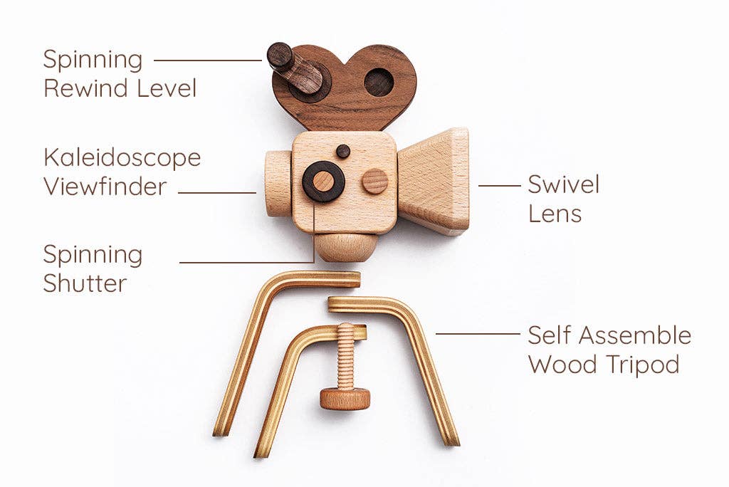 The build-in kaleidoscope viewfinder enhances creativity in children. The Super16 Wooden Toy Camera is designed to fit perfectly in a child's hand, and it can be interchanged with our wooden tripod to double as interior decor.